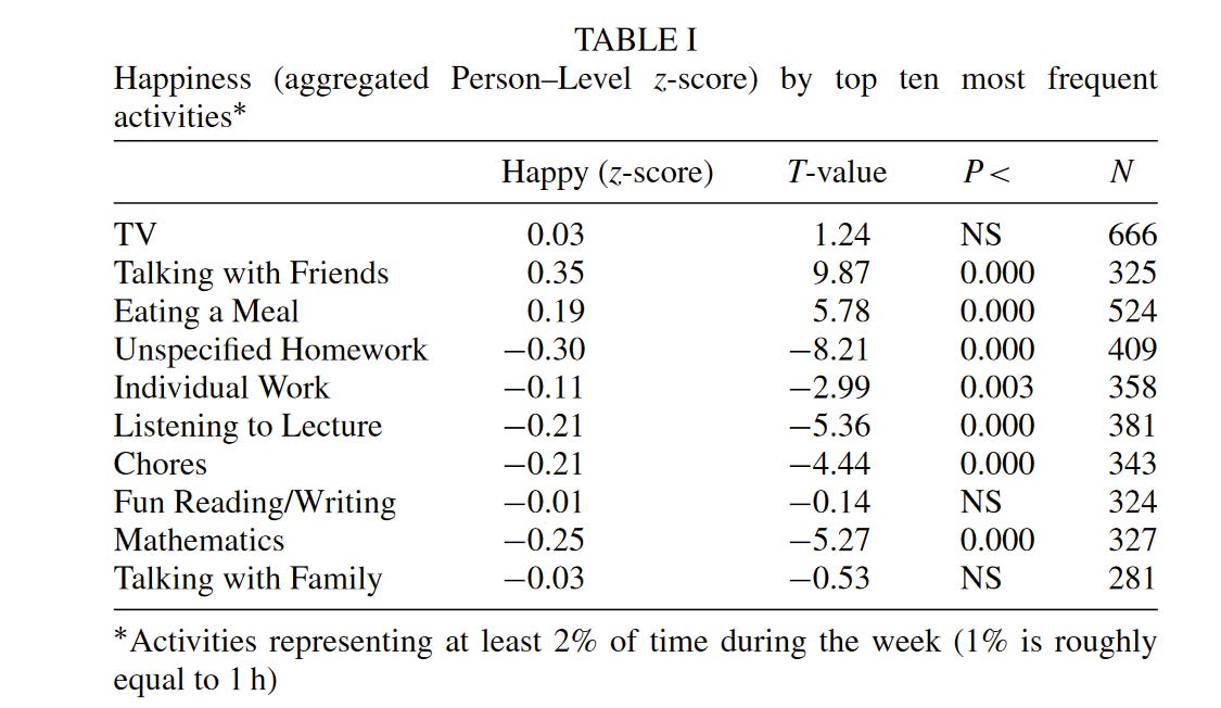 The column to look at in this table is “Happy (z-score)”. The numbers in that column tell you, for example, how much happier were people when watching TV on average, compared to the overall average happiness level in the study. So positive numbers for an activity mean happier than average, and negative numbers mean less happy than average. (If you’re curious, the units are standard deviations of the whole sample, so a z-score of 1 means 1 standard deviation above mean happiness). This is based on their answers in the moment to how happy-to-sad they were on a 7 point scale, and what main activity they were doing.