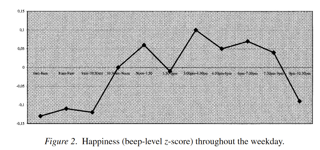As I mention a lot on this blog, I track my happiness using experience sampling. Then I can use this data to see what activites etc. correlate with me feeling better or worse. This week I got curious to see this kind of data for larger groups of people beyond myself, so I did a little Google for experience sampling studies of happiness, and I’ll share just a couple of things here I found interesting from just one of the studies (Hopefully I’ll share some stuff from the others in future, and may or may not end up writing a full post talking about stuff from all the different studies and my personal data).